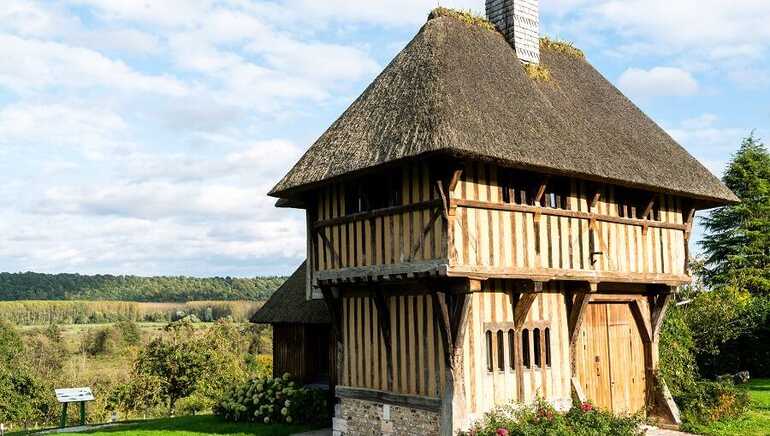 Overlooking the wetland, this thatched cottage, the only one of its kind in France with its unique shape, now houses the town hall of Saint-Sulpice. Its medieval framework displaying corbels on three sides and a gallery at the back makes it an extraordinary site in Normandy. Built in 1420 some 10 kilometres away from here by English carpenters during the Hundred Years' War, this thatched-covered building has been disassembled and completely restored on this site overlooking the wetland.